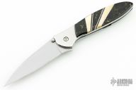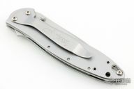 This Kershaw assisted opening flipper has been customized by Santa Fe Stoneworks, it features a bead blast blade and back side of the stainless steel frame. Aztec Gold Marble and Gold Lip Pearl  scale on front of handle, tip up or down reversible stainless steel clip. Nice lock up, blade seating and detent. Has some scratches, otherwise excellent condition. Comes with a black leather slip sheath