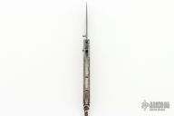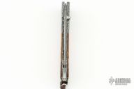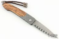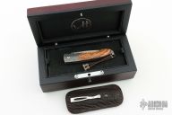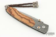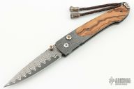 This B10 Kalamata button lock folder by William Henry Knives features a Wave pattern ZDP-189 core Damascus blade with a single thumbstud with a citrine inlay. The handle has Delbert Ealy carbon Damascus bolsters with integral liners, olive wood scales, push button with critine inlay, lanyard bail with sterling silver bail and beads. Includes box, sheath and papers and COA dated August 29, 2008. Excellent condition.