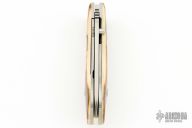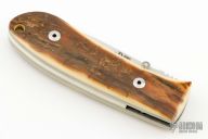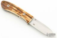 This DK-FHM linerlock folder by Dozier Knives has a satin finished D2 stainless steel drop point blade with notched thumb rest and single thumb stud. Handle is has beautiful mammoth ivory scales, titanium liners and a mammoth ivory backspacer. Excellent condition. Dated 2007. Beautiful knife. Comes with original brown leather sheath.