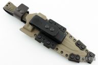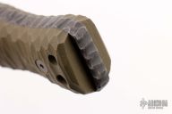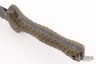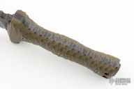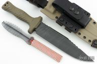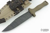 This Custom M-22 by Miller Bros Blades features a two-tone clip point blade with textured spine made from Z-Wear PM steel, .307" blade stock 1.966" blade depth, full tang construction. The handle has textured green G-10 scales, lanyard holes at the butt. Comes with a kydex/leather sheath and COA dated 1-2024. New condition.
