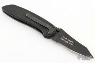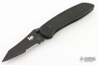 The H&K Scorch Prototype features a unique dual-action design. The black blade has a reverse tanto design with notched thumbrest and dual thumbstuds. The handle is textured black G-10 with black stainless steel liners and tip down clip. Comes with H&K drawstring bag and incorrect box. Has some blade play in the open position, blade favors the right side. Has a couple light scuffs, otherwise excellent condition.