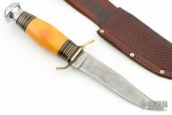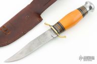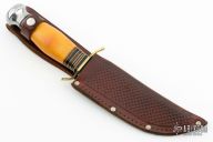 This knife by Cattaraugus features a satin finished blade with false top edge, .118" blade stock and .951" blade depth, hidden tang construction. The handle has a brass guard and aluminum butt with a yellow bone grip and black/brass/red spacers. Comes with a brown leather sheath. Has scratches, has some pitting, has been resharpened, otherwise good condition for its age.