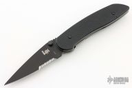 The H&K Scorch Code 3 features a unique dual-action design. The knife has a black drop point blade with serrations, notched thumbrest and dual thumbstuds. The handle is textured black FRN with black stainless steel liners and tip down clip. Comes with original box, papers, and drawstring pouch. Has some scuffs and scratches, great condition otherwise.