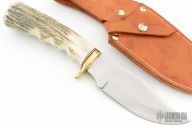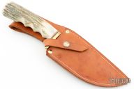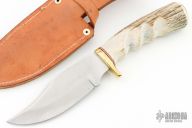 This knife by Harry L Morris features a satin finished blade with false top edge, .165" blade stock and 1.697" blade depth, hidden tang construction. The handle has a brass guard and a stag grip with finger grooves, black/white/red spacers. Comes with a brown leather sheath. Has some light scratches and a couple small sots on the blade, otherwise good condition. #042 dated 2007