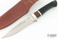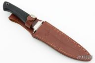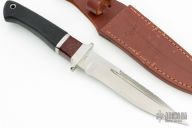 This Baby Hattori Fighter by Junglee Knives features a satin finished recurve blade with false top edge and partial serrations, .198" blade stock and 1.353" blade depth, hidden tang construction. The handle has a nickel silver guard with checkered rubber grip, nickel silver and wood spacers. Comes with a brown leather sheath. Has some scratches, otherwise good condition.