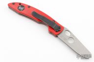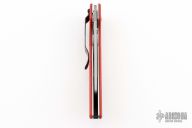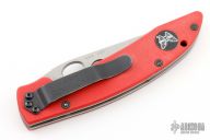 This trainer by Benchmade features a stonewashed trainer blade, notched thumbrest and dual thumbstuds. The handle has red G-10 scales over a stainless steel sub frame. Lanyard hole in pommel. The tip up steel clip can be mounted for left or right hand carry. AXIS locking mechanism. Comes with belt sheath, and BM box marked prototype. Has some light scuffs, excellent condition otherwise.