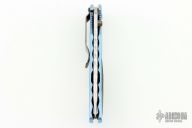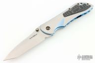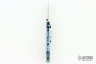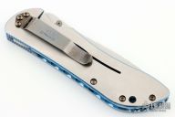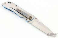 This 910TI by Benchmade is a limited edition of 100 pieces, this one is #33. It features a satin finished tanto S30V blade with single thumbstud and fileworked/milled blade spine, notched thumbrest. The handle has a two-tone titanium frame with satin finished flats and blue anodized edges and interiors, fileworked inside edges of the frame, carbon fiber inlay, tip down black stainless steel clip, lanyard hole. Comes with original box and papers. Excellent condition otherwise.