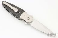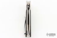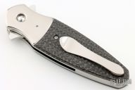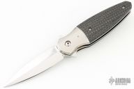 This Folding Dagger by Peter Martin features a mirror polish finished blade with flipper tab. The handle has milled titanium bolsters, checkered carbon fiber scales, polished titanium liners, matching backspacer and tip up clip with hidden screws. Marked "MARTIN" inside backspacer. Nice detent, lockup and blade seating. Comes with a zippered case. Excellent condition.