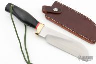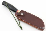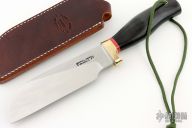 This Chef's Knife by Randall Made Knives features a satin finished blade with notched thumbrest, .241" blade stock and 1.618" blade depth, hidden tang construction. The handle has a brass guard, red spacers, black linen micarta with a comfortable handle grip, wrist thong. Designed for kitchen use. Comes with original paper wrapping and brown leather sheath. Excellent condition.