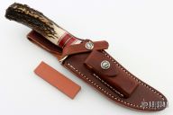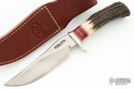 The Model 27 is an ideal all-around heavy-duty sportsman's knife. This knife has a satin finished blade with .227" blade stock and 1.412" blade depth, hidden tang construction. The handle has a nickel silver guard and butt, stag grip with red/duralumin/white/red linen micarta/black/brass spacers. Comes with a brown leather sheath and original paper wrapping. New from maker.