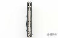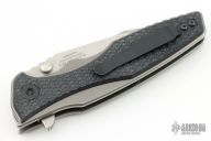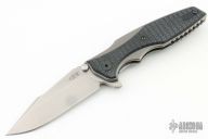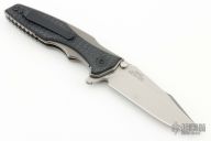 This Hinderer KVT by Zero Tolerance features a stonewashed blade with notched thumbrest and flipper. The handle has black G-10 scales, stonewashed titanium frame, black stainless steel tip up reversible clip. #0355. Has a couple light scuffs, otherwise excellent condition.