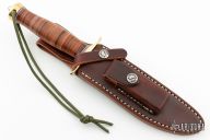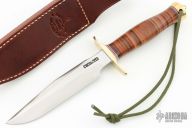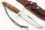 The Model 1 Fighter by Randall Made Knives has a satin finished blade with sharpened top edge, .192" blade stock and 1.183" blade depth, hidden tang construction. The handle has a brass double guard, stacked leather finger grip handle with red/white/blue spacers, brass butt. Comes with a brown leather sheath and original paper wrapping. New from maker.