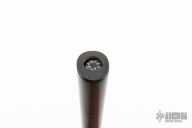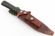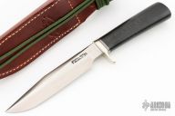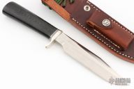 This Model 5 Camp and Trail Knife by Randall Made Knives features a satin finished blade with false top edge and notched thumbrest, .218" blade stock and 1.155" blade depth, hidden tang construction. The handle has a nickel silver single guard and a black linen micarta grip with compass in butt, black/duralumin spacers. Comes with a brown leather sheath and original paper wrapping. New from maker.
