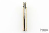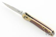 This Benchmade 710-01 McHenry has a satin finished D2 Steel drop point blade with dual thumb studs. Handle is brass with wood inlay and backspacer. Comes with a Benchmade Box. Has patina, scuffs, scratches, and some oxidation on the blade. Could use a little TLC and look much better. Good user condition.