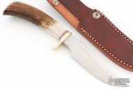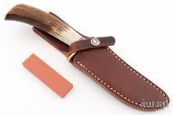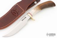 This Model 3-5 by Randall Made Knives features a satin finished blade with false top edge, .197" blade stock and 1.143" blade depth, hidden tang construction. The handle has a brass guard, stag grip with compass in butt, red/white/blue spacers. Comes with a brown leather sheath and original paper wrapping. New from maker.