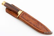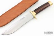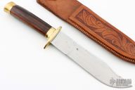 This bowie features a mirror  finished blade with sawteeth on the spine, .131" blade stock and 1.449" blade depth, hidden tang construction. The handle has a brass guard and butt with a rosewood grip. Comes with a hand tooled brown leather sheath. Has some light scratches and oxidation, otherwise good condition. This knife is sterile with no markings.