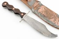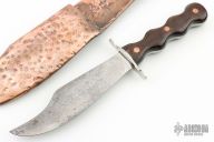 This bowie features a clip point blade with .170" blade stock and 1.433" blade depth, full tang construction. The handle has a steel guard, wood scales. Comes with a hammered copper sheath. The blade is inscribed with "Africa" and the tang is signed "Harry". Has some scratches and pitting, otherwise fair condition.