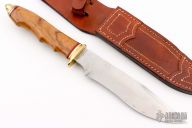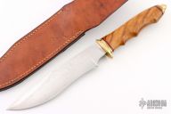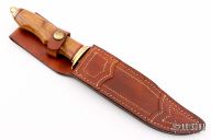 This fighter features a satin finished blade with false top edge and visible temper line, .160" blade stock and 1." blade depth, hidden tang construction. The handle has a brass guard and butt, olivewood grip, black/red spacers. Comes with a brown leather sheath. Has some patina, otherwise excellent condition.