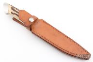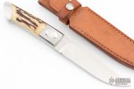 This Large Hunter by Robert Papp features a mirror polished blade with satin finished flats, .253" blade stock and 1.275" blade depth, full tapered tang construction. The handle has dovetailed stainless steel bolsters, front and rear, stag scales. Comes with a brown leather sheath. Has a couple light scratches, otherwise excellent condition.