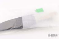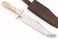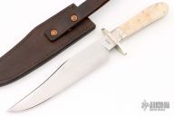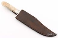 This Bowie by Peter Bromley features a polished clip point blade with false top edge, .228" blade stock and 1.512" blade depth, full tapered tang. The handle is comprised of a nickel silver guard and bolsters, oosic scales. Includes leather sheath with belt loop. Has a few light scratches and oxidation spots, otherwise good condition.
