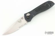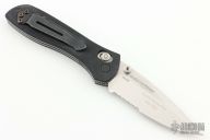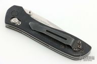 This 707 from Benchmade features a satin finished spear point blade with dual thumbstuds and a false top edge. The handle has anodized aluminum scales and black G-10 inserts, stainless steel liners, and a black backspacer. Tip up reversible stainless steel clip. Has scuffs and scratches, good condition otherwise.