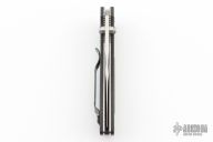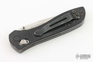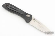 This 707 from Benchmade features a satin finished spear point blade with dual thumbstuds and a false top edge. The handle has anodized aluminum scales and black G-10 inserts, stainless steel liners, and a black backspacer. Tip up reversible stainless steel clip. Has scuffs and scratches, good condition otherwise.