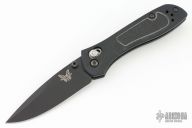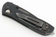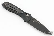 This 707 from Benchmade features a black spear point blade with dual thumbstuds and a false top edge. The handle has anodized aluminum scales and black G-10 inserts, stainless steel liners, and a black backspacer. Tip up reversible stainless steel clip. Has scuffs and scratches, great condition otherwise.