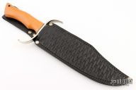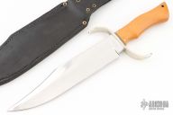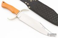 This bowie by Frank Nolton features a mirror polished blade with a false top edge, .290" blade stock and 1.775" blade depth, hidden tang construction. The handle has a nickel silver guard, yellow paper micarta grip and white/black spacers. Comes with a hand tooled black leather sheath. Has a few light scratches, otherwise excellent condition.