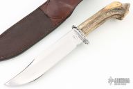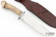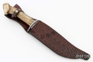 This Bowie by James Barry features a mirror polished blade with false top edge, .193" blade stock, 1.494" blade depth, hidden tang construction. The handle has a stainless steel guard with twisted wire border, crown stag grip. Comes with a hand tooled brown leather sheath. Has a couple light scratches, otherwise excellent condition.