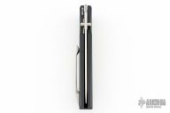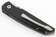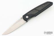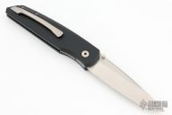 This D/A Harkins ATAC has a satin plain edge blade that is sterile and has dual thumbstuds and false top edge. The hanlde has a black aluminum frame with carbon fiber inlays, one of which is a hidden button to fire the knfie. Tip up orange peel finished titanium clip. #87 of 200 on the frame. Has a couple light scuffs, excellent condition otherwise.
