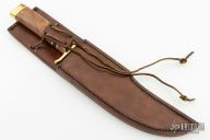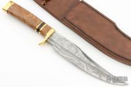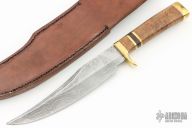 This Bowie by Dan Harrison features a 512 layer Damascus blade (5160 & 1018) clip point blade with nearly sharpened top edge, .207" blade stock and 1.515" blade depth, hidden tang construction. The handle has a brass guard and pommel with a burl wood grip with brass spacers. Includes a brown leather sheath with belt loop. Excellent condition.