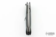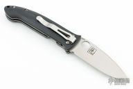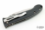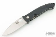 This Mini-Dejavoo by Benchmade features a satin finished drop point blade with false top edge and thumbhole. The handle has black G-10 scales, stainless steel and titanium liners, and a black FRN backspacer, tip down black stainless steel clip. Comes with a Benchmade box and a drawstring pouch. Has some scuffs and scratches, and a little oxidation. Great condition otherwise.