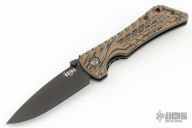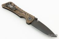 This Spider Monkey Linerlock folder by Southern Grind features a black drop point blade with dual thumb studs and a notched thumbrest. Handle has milled camo G-10 scales over black titanium liners and barrel spacers, black stainless steel tip up clip, and lanyard hole. Includes original box and papers.  Excellent condition.