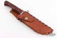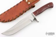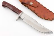 This Large Hunter by Lou Hegedus features a satin finished clip point blade with false top edge, .176" blade stock and 1.476" blade depth, full tang construction. The handle has a stainless steel guard with red linen micarta scales. Comes with a brown leather sheath. Has some scratches, has been resharpened, otherwise good condition.