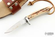 This Bird and Trout by Lou Hegedus features a satin finished drop point blade with .147" blade stock and .594" blade depth, full tang construction. The handle has a stainless steel guard with stag scales. Comes with a brown leather sheath. Has some scratches, has some oxidation, otherwise good user condition.