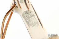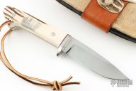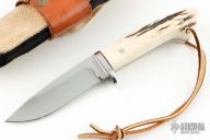 This Hunter by Lou Hegedus features a mirror finished drop point blade with .195" blade stock and .979" blade depth, full tapered tang construction. The handle has a stainless steel guard with stag scales and red liners, has scrimshaw of an eagle's head. Comes with a brown leather sheath. Has some light scratches, has some oxidation where the tang meets the guard, otherwise good condition.