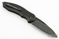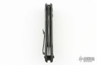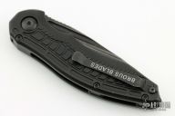 This Bionic auto from Brous Blades (#0435 of 1000) has a black drop point blade with blood grooves and notched thumbrest. Handle is black anodized aluminum over stainless steel subframe. Tip up clip is RH/LH reversible. Smooth and fast automatic action and no blade play. Has a couple scuffs, otherwise excellent condition.
