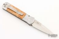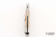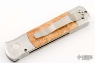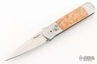 This Godson by Pro-tech features a satin finished spear point blade with false top edge. The handle has a satin finished stainless steel frame with maple burl inlays and satin stainless steel clip. Comes with original box and papers. Has some scratches, otherwise good condition.