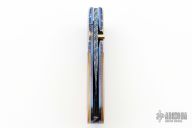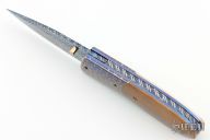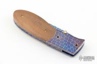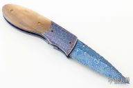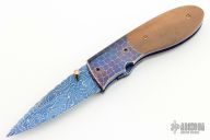 This knife by Jeff Chaffee features a blued Damascus blade with fileworked spine and a single 14kt gold thumbstud with flower filework. The handle has blued Damascus bolsters, mammoth ivory scales, anodized titanium liners and a fileworked blued Damascus backspacer. Nice detent, lockup and blade seating. Excellent condition. Comes with a zippered case.