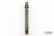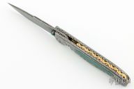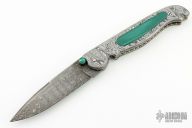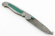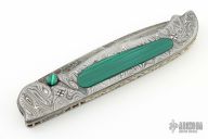 This linerlock by MAL Knives features a Damascus blade with dual Malachite thumbstuds. The handle has carved Damascus scales with malachite inlays, fileworked titanium liners, fileworked brass backspacer. Nice detent, lockup and blade seating. Excellent condition. Comes with a zippered case.