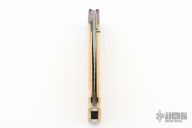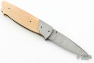 This attractive linerlock from L.A. McConnell features a Damascus blade with a single thumbstd. The handle has Damascus bolsters, walrus ivory scales, anodized titanium liners, stainless steel backspacer. Nice detent, lockup and blade seating. Has a couple light scratches, otherwise excellent condition. Comes with a zippered case.