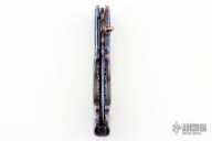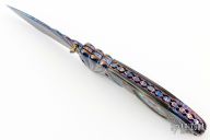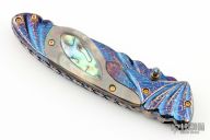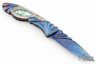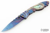 This linerlock features a carved and blued mosaic Damascus blade with single brass thumbstud with blue stone inlay. The handle has carved blued mosaic Damascus bolsters, black lip pearl and abalone scales, gold plated screws, fileworked and anodized titanium liners and a fileworked blued mosaic Damascus backspacer. Nice detent and lockup. Excellent condition. Comes with a zippered case.