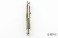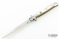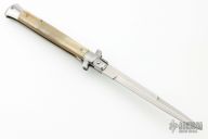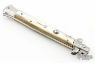 This 11" Swivel Bolster marked ITALY INOX features a polished flat ground blade with false top edge. The handle has stainless steel bolsters, front and rear, honey horn scales, brass liners, stainless spring. Has a few light scratches, otherwise excellent condition.