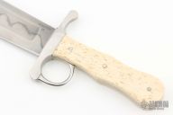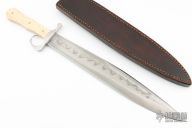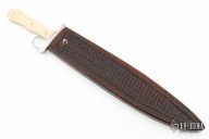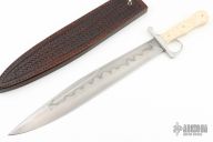 This Laserre Bowie by Journeyman Smith Craig Camerer is a recreation of a Historical Bowie from the 1840-50s. It features a spear point blade with sharpened top edge, nice hamon and wide fullers, .172" blade stock and 2.043" blade depth, frame/hidden tang construction. The handle has a stainless steel guard with integral ring and frame tang, stabilized giraffe bone scales, nickel silver domed pins. It comes with a beautiful hand-tooled brown leather sheath with a belt stud. It comes with a zippered case. Excellent condition.