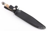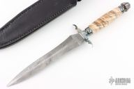 This Dagger by Todd Kopp features a Brad Vice Alabama Damascus double-edged blade with .132" blade stock and 1.498" blade depth, hidden tang construction. The handle has flame blued steel guard, butt and collar, fluted stabilized mammoth tooth grip with twisted gold wire inlays. Comes with a black leather sheath, not original, but it fits. Excellent condition. Comes with a zippered case. Has some light patina on the blade, otherwise excellent condition.