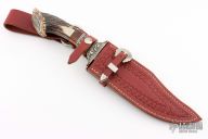 This Bowie by Jim Sornberger features a hand rub satin finished blade with false top edge, .241" blade stock and 1.485" blade depth, hidden tang construction. The handle has an engraved nickel silver guard with gold nugget inlays, crown stag grip and black/walnut spacers, engraved nickels silver spacer with gold nugget inlays. Comes with a hand tooled brown leather sheath. Excellent condition. Comes with a zippered case.