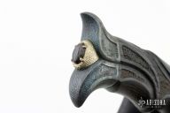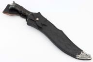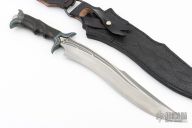 This Persian Fighter by Mark Banfield features a hand rub satin finished blade with hamon, false top edge, stippled and carved fullers, .260" blade stock and 2" blade depth, hidden tang construction. The handle has a carved darkened steel guard, carved bog oak grip, stippled nickel silver butt embellishment with stone inlay. Comes with a hand tooled brown leather sheath with nickel silver overlay on the end. Excellent condition.