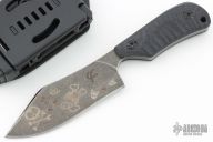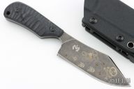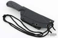 This Baby Bowie by Max Knives is a Fred Perrin design. It has a laser engraved blade with .172" blade stock and 1.464" blade depth, full tang construction. The handle has black G-10 scales. Comes with a kydex sheath with belt loop and neck lanyard, and original box. New from maker.