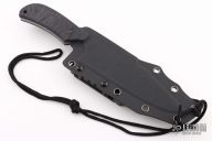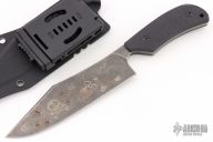 This Big Bowie by Max Knives is a Fred Perrin design. It has a laser engraved blade with .189" blade stock and 1.501" blade depth, full tang construction. The handle has black G-10 scales. Comes with a kydex sheath with belt loop and neck lanyard, and original box. New from maker.