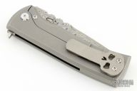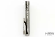 This Chaves Ultramar Redencion Tanto features a Damasteel chisel ground blade. The handle is made up of stonewashed titanium, skull pocket clip (positioned for tip up carry), and a matching titanium backspacer. Comes with original box and an extra regular titanium pocket clip. The knife opens with the use of Lee Williams' Kick Stop flipper.  Includes the original box and extra clip. Excellent condition.
